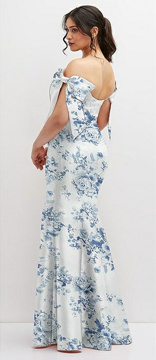 Off-the-Shoulder Bow Floral Satin Corset Dress with Fit and Flare Skirt in cottage rose larkspur