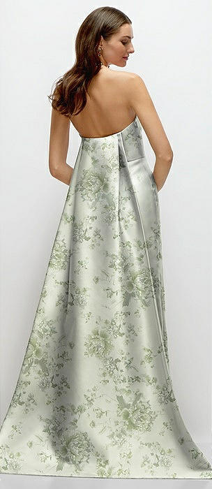Strapless Floral Satin Column Dress with Removeable Watteau Train in sage cottage rose