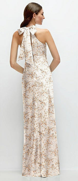 Floral Twist Pleated Halter Bias Satin Maxi Dress with Self-Tie Bow Back in golden hour