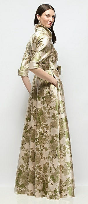 Oscar Metallic Floral Jacquard Shirt Dress Gown with Sash and Jeweled Buttons in evergreen floral