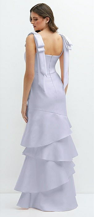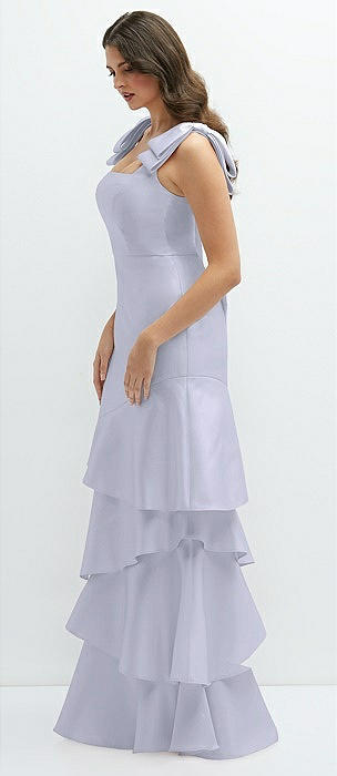 Bow-Shoulder Satin Maxi Dress with Asymmetrical Tiered Skirt in silver dove