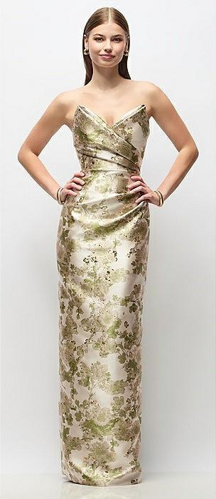 Strapless Asymmetrical Draped Abstract Floral Jacquard Column Maxi Dress in peridot blush