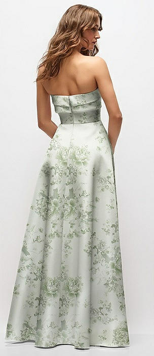 Strapless Twist Cuff Neck Floral Satin Maxi Dress with Basque-Waist & Full Skirt in sage cottage rose