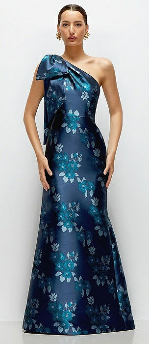 Midnight Navy Bow One-Shoulder Baroque Rose Damask Maxi Dress with Trumpet Skirt in midnight navy damask