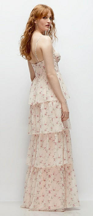 Bustier-Style Chiffon Tiered Ruffle Maxi Dress with Adjustable Straps in coquette floral print