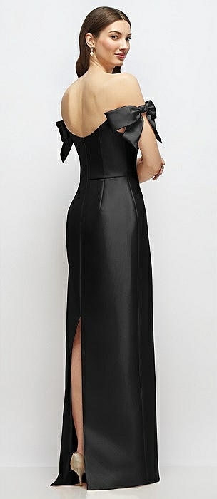 Basque-Neck Satin Column Maxi Dress with Off-the-Shoulder Bows in black