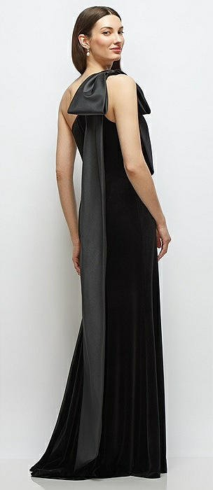 One-Shoulder Black Velvet Maxi Dress with Large Trailing Satin Bow in black