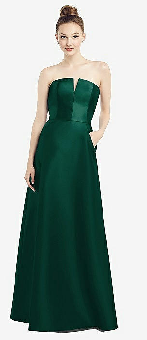 Strapless Notch Satin Gown with Pockets in hunter green