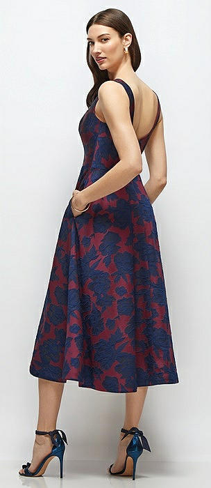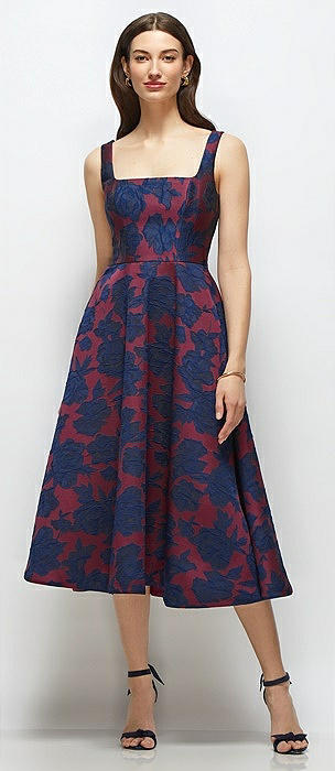 Square Neck Heritage Floral Jacquard Midi Dress in burgundy midnight floral