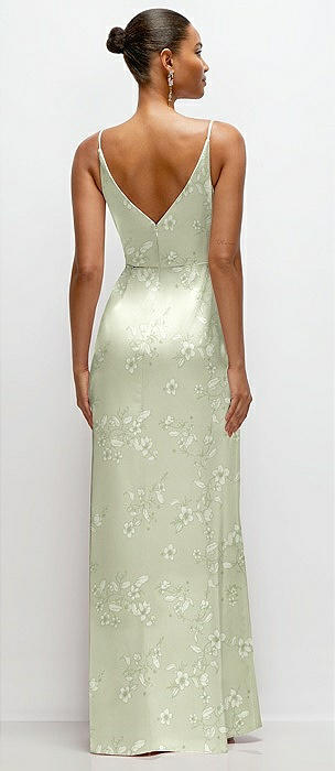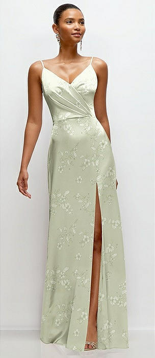 Floral Pleated Faux Wrap Satin Maxi Dress with Adjustable Spaghetti Straps in vintage primrose celadon