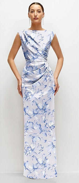 Floral High Neck Sleeveless Cap Shoulder Satin Maxi Dress in magnolia sky