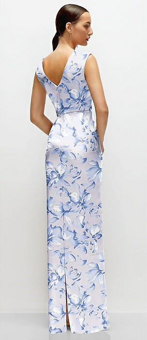 Floral Bow-Shoulder Satin Maxi Dress with Asymmetrical Tiered Skirt in cottage rose larkspur