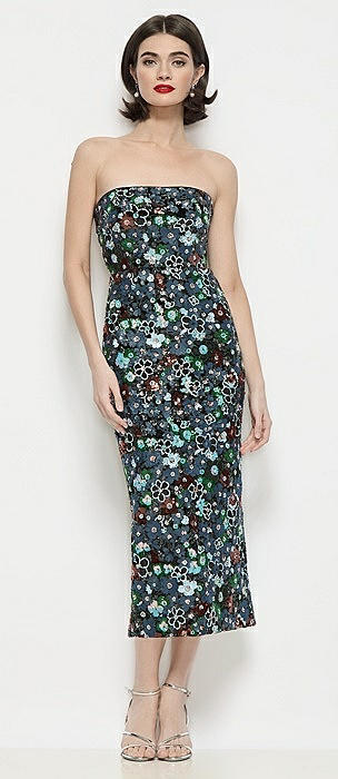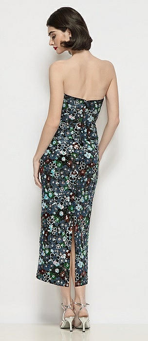 Strapless Column Stretch Floral Sequin Midi Dress in black multi