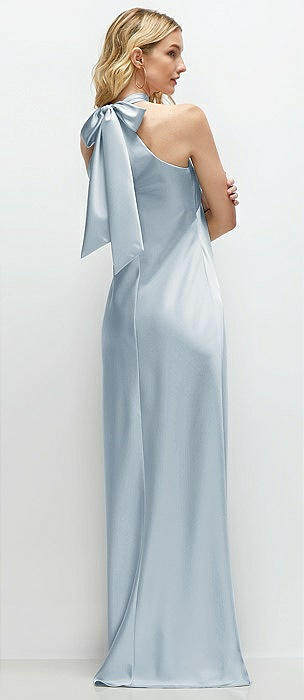 Stand Collar Bias Satin Maxi Dress with Self-Tie Bow Back in mist