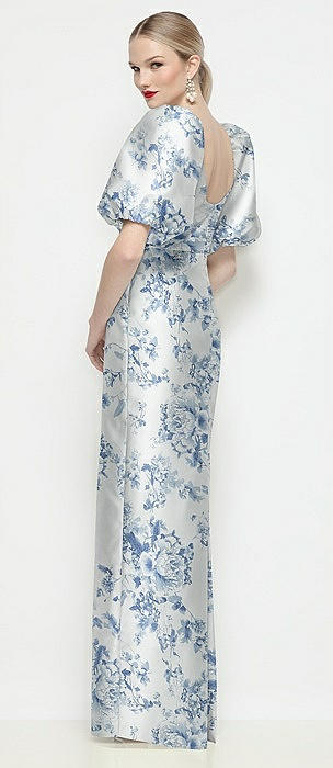 Bateau Neck Floral Satin Column Maxi Dress with Puff Sleeves in cottage rose larkspur