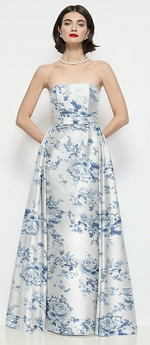 Strapless Bow-Waist Floral Satin Column Dress with Overskirt in cottage rose larkspur