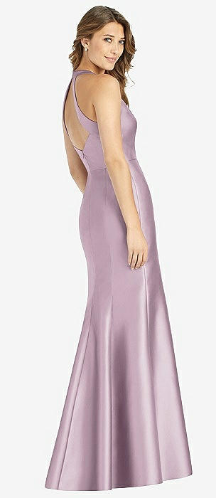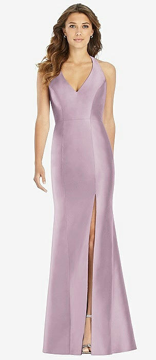 V-Neck Halter Satin Trumpet Gown in suede rose