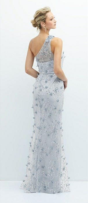 One-Shoulder Fit and Flare 3D Floral Embroidered Dress in silver dove
