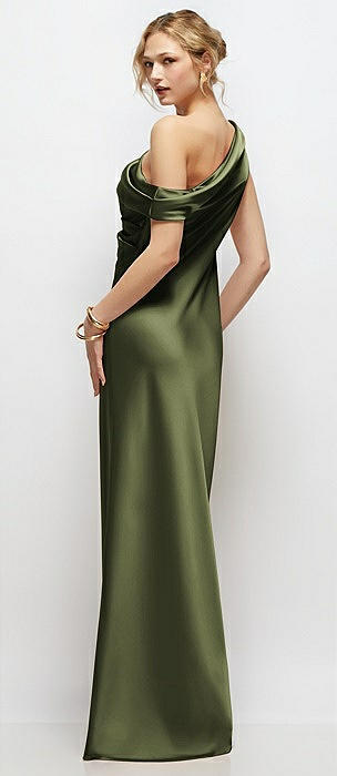 Asymmetrical Off-the-Shoulder Pleated Satin Maxi Dress in olive green