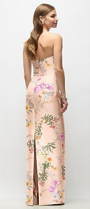 Strapless Asymmetrical Draped Satin Column Floral Maxi Dress in butterfly botanica pink sand