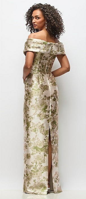 Basque-Neck Floral Satin Column Maxi Dress with Off-the-Shoulder Bows in sage cottage rose
