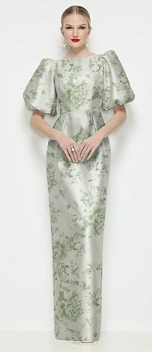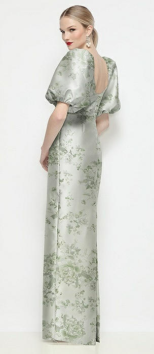 Bateau Neck Floral Satin Column Maxi Dress with Puff Sleeves in sage cottage rose