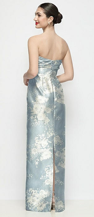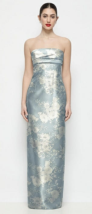 Strapless Pleated Empire Floral Satin Column Maxi Dress in porcelain blue seraphina floral