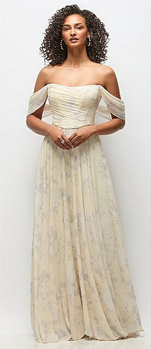 Off-the-Shoulder Basque Corset Floral Chiffon Maxi Dress in butter yellow floral