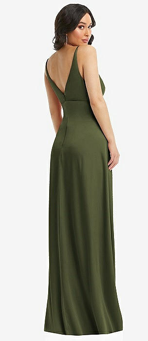 Sleeveless Draped Wrap Bodice Stretch Satin Column Maxi Dress in olive green