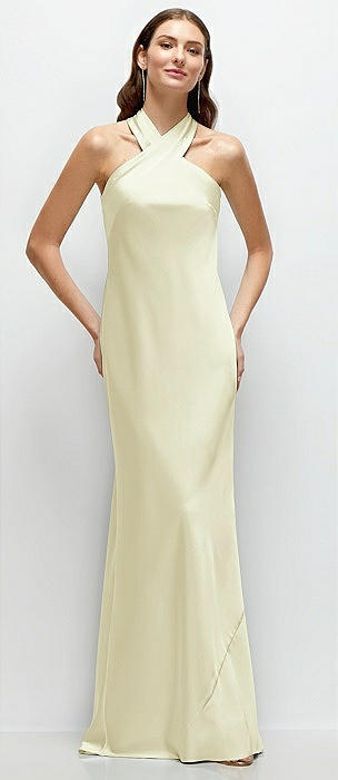 Pleated Halter Bias Satin Maxi Dress with Self-Tie Bow Back in butter yellow