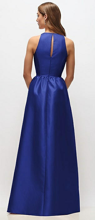 Jewel Neck Halter Full A-Line Satin Maxi Dress in cloudy