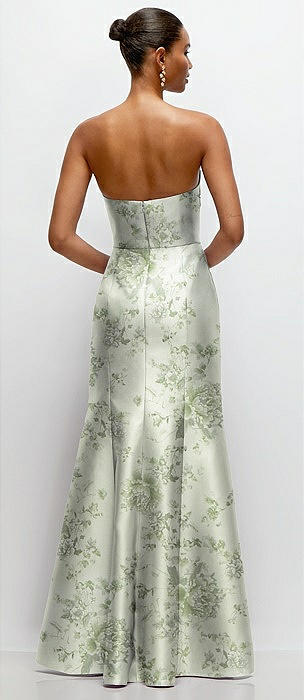 Strapless Cat-Eye Draped Bodice Floral Satin Tumpet Dress in sage cottage rose