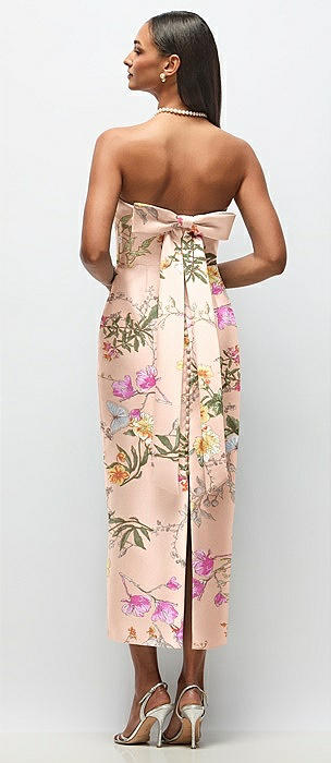 Strapless Cuff Floral Satin Midi Dress with Column Skirt & Back Bow in butterfly botanica pink sand