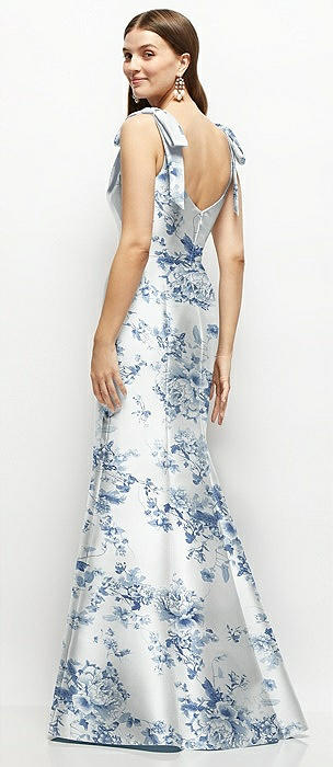 Deep V-back Floral Satin Trumpet Dress with One-Shoulder Cascading Bow in cottage rose larkspur