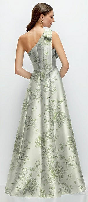 Bow One-Shoulder Full A-Line Floral Satin Maxi Dress in sage cottage rose