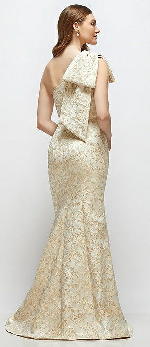 Bow One-Shoulder Champagne Brocade Maxi Dress with Trumpet Skirt in champagne filigree