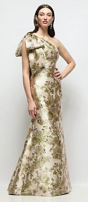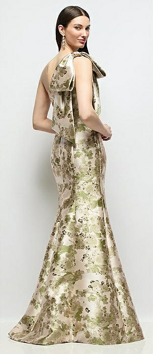 Bow One-Shoulder Abstract Floral Jacquard Maxi Dress with Trumpet Skirt in peridot blush