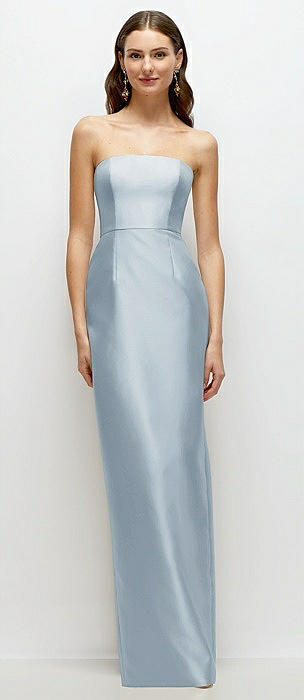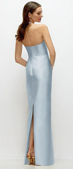 Strapless Floral Satin Column Dress with Back Slit in bow and blossom print