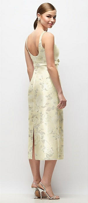 Scoop Neck Floral Satin Column Midi Dress with Bow at Empire Waist in butter yellow floral