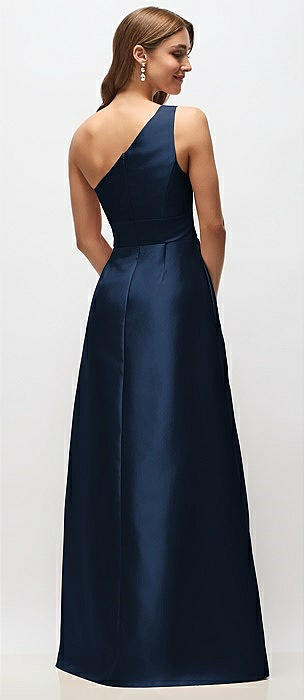 Draped One-Shoulder Satin Maxi Dress with Pockets in midnight navy