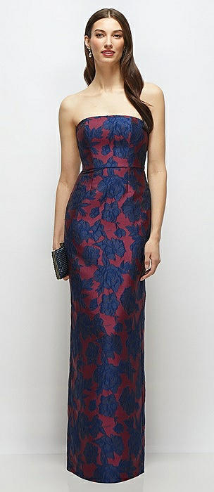 Strapless Heritage Floral Jacquard Column Dress with Back Slit in burgundy midnight floral