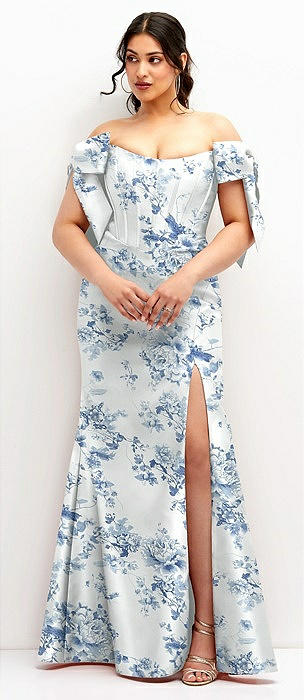Off-the-Shoulder Ruffle Neck Floral Satin Trumpet Gown in bow and blossom print