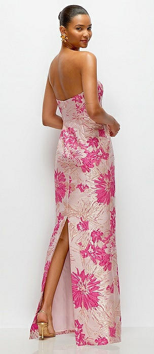 Hibiscus Pink Strapless Floral Jacquard Column Dress with Back Slit in hibiscus pink multi