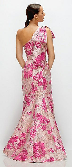 Hibiscus Pink Bow One-Shoulder Floral Jacquard Maxi Dress with Trumpet Skirt in hibiscus pink multi
