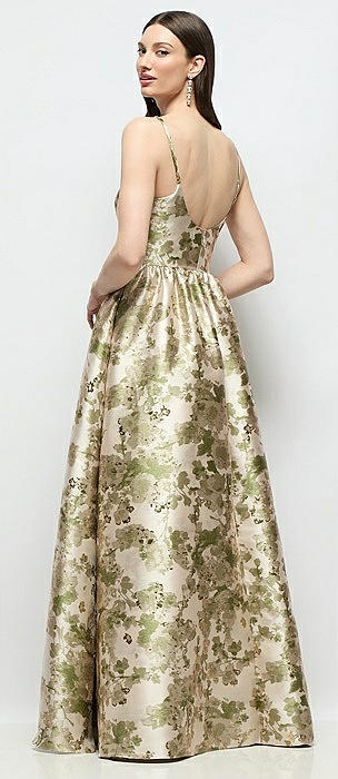 Scoop Neck Drop Basque Skirt Abstract Floral Jacquard Maxi Dress with Pockets in peridot blush