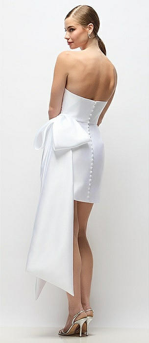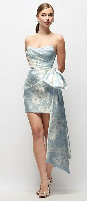 Strapless Pleated Draped Floral Satin Mini Dress with Dramatic Long Tail Bow & Covered Buttons in porcelain blue seraphina floral