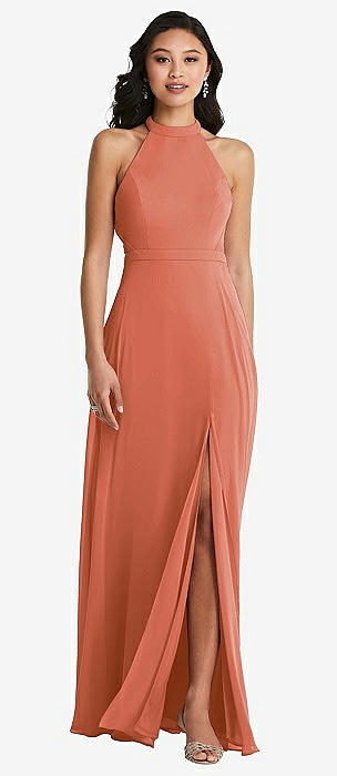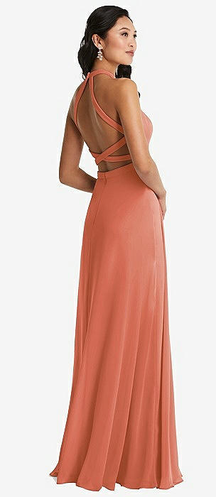 Stand Collar Halter Maxi Dress with Criss Cross Open-Back