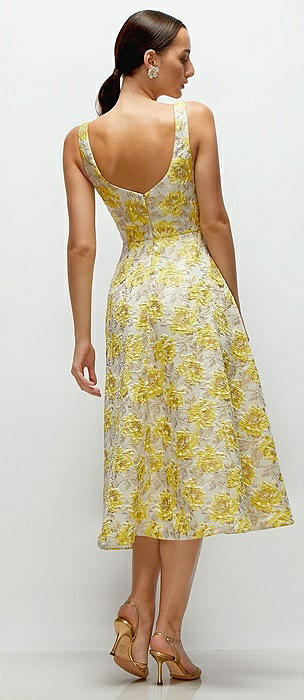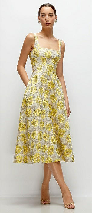 Golden Yellow Square Neck Floral Jacquard Midi Dress in golden yellow