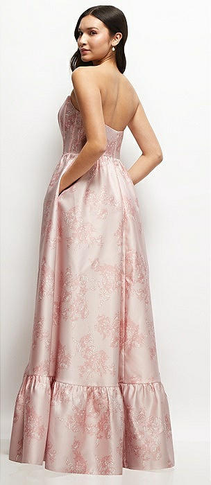 Strapless Cat-Eye Corset Hibiscus Pink Floral Jacquard High-Low Dress with Ruffle Hem in hibiscus pink multi