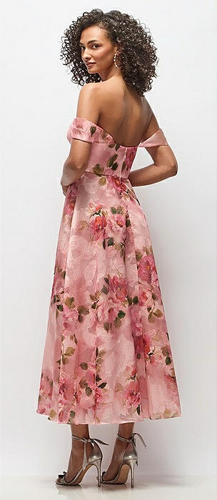 Strapless Organza Jacquard Bustier Midi Dress with Off-the-Shoulder Swags in guava floral print